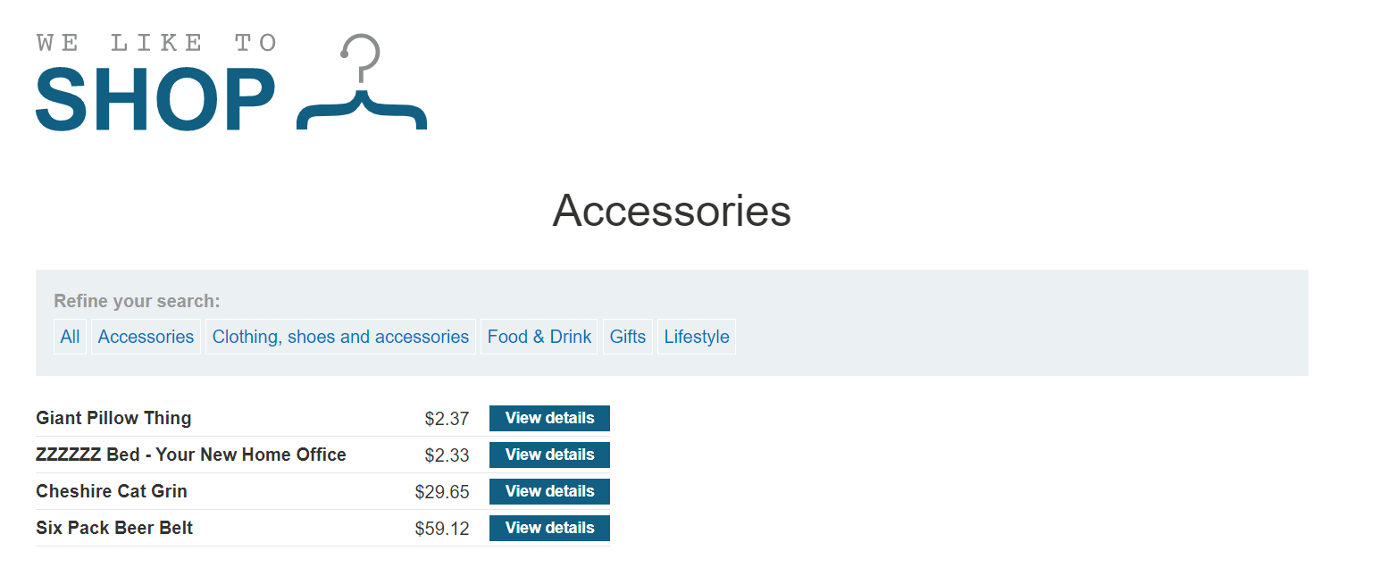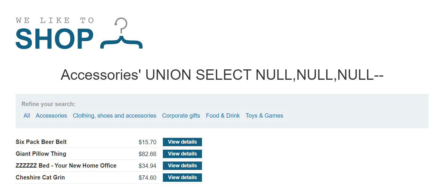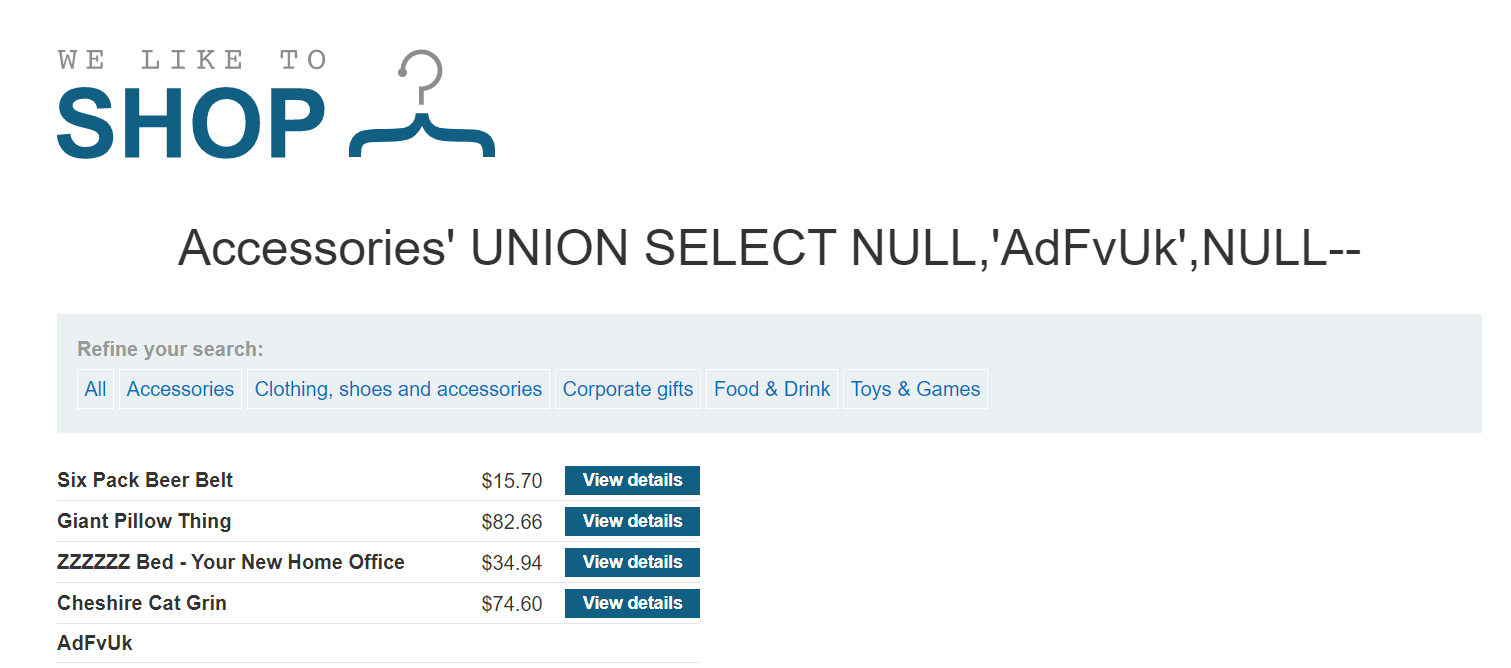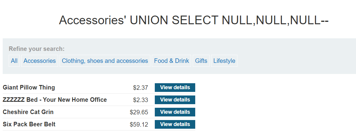 Product 카테고리에 SQL Injection 취약점이 있다. 쿼리 결과가 애플리케이션의 응답에 그대로 반환되므로 다른 테이블의 데이터를 조회하기 위해 UNION 공격을 사용할 수 있다.