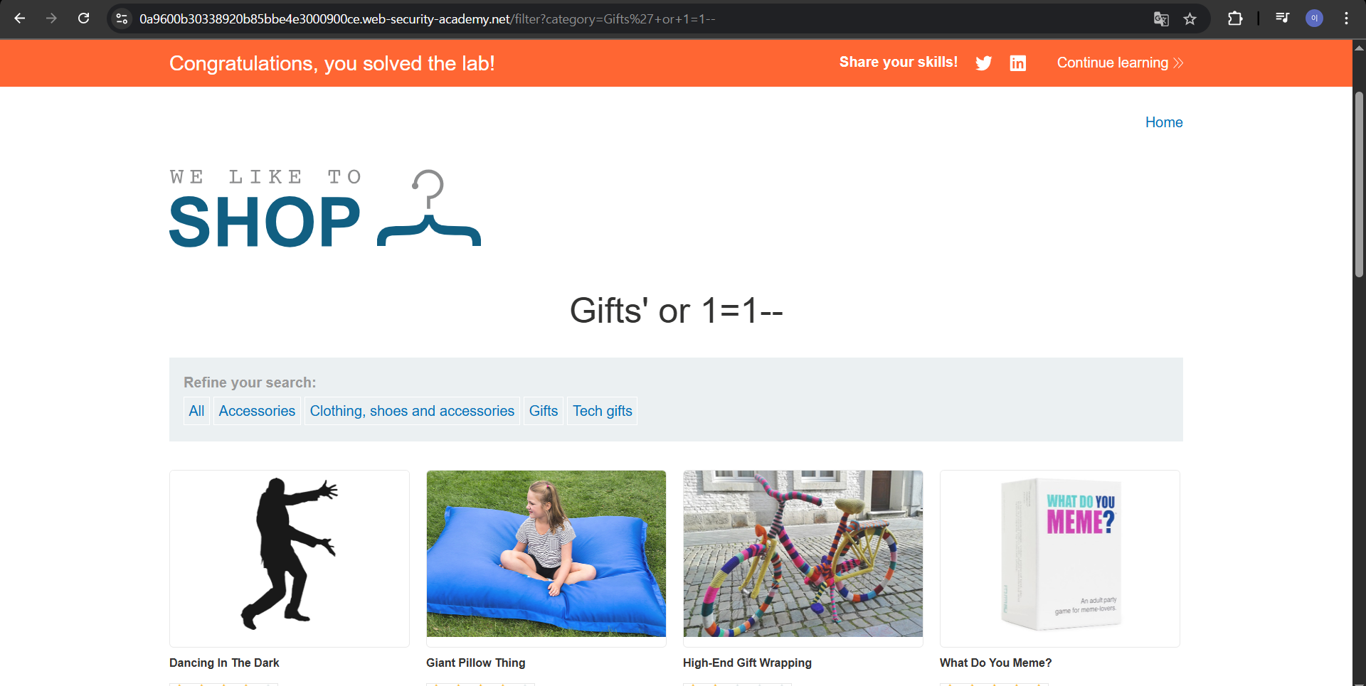 SELECT * FROM products WHERE category = 'Gifts' OR 1=1