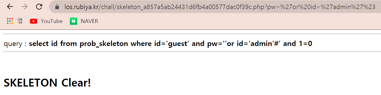 일단 pw는 빈칸으로 만들고, 뒤에 id='admin'을 입력한 뒤에 뒤는 무력화해주기
