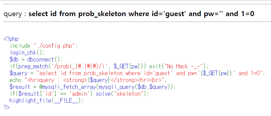 id='guest', pw='' 그리고 뒤에 and 1=0을 넣어서 값을 무조건 거짓이 되게 하고 있다.