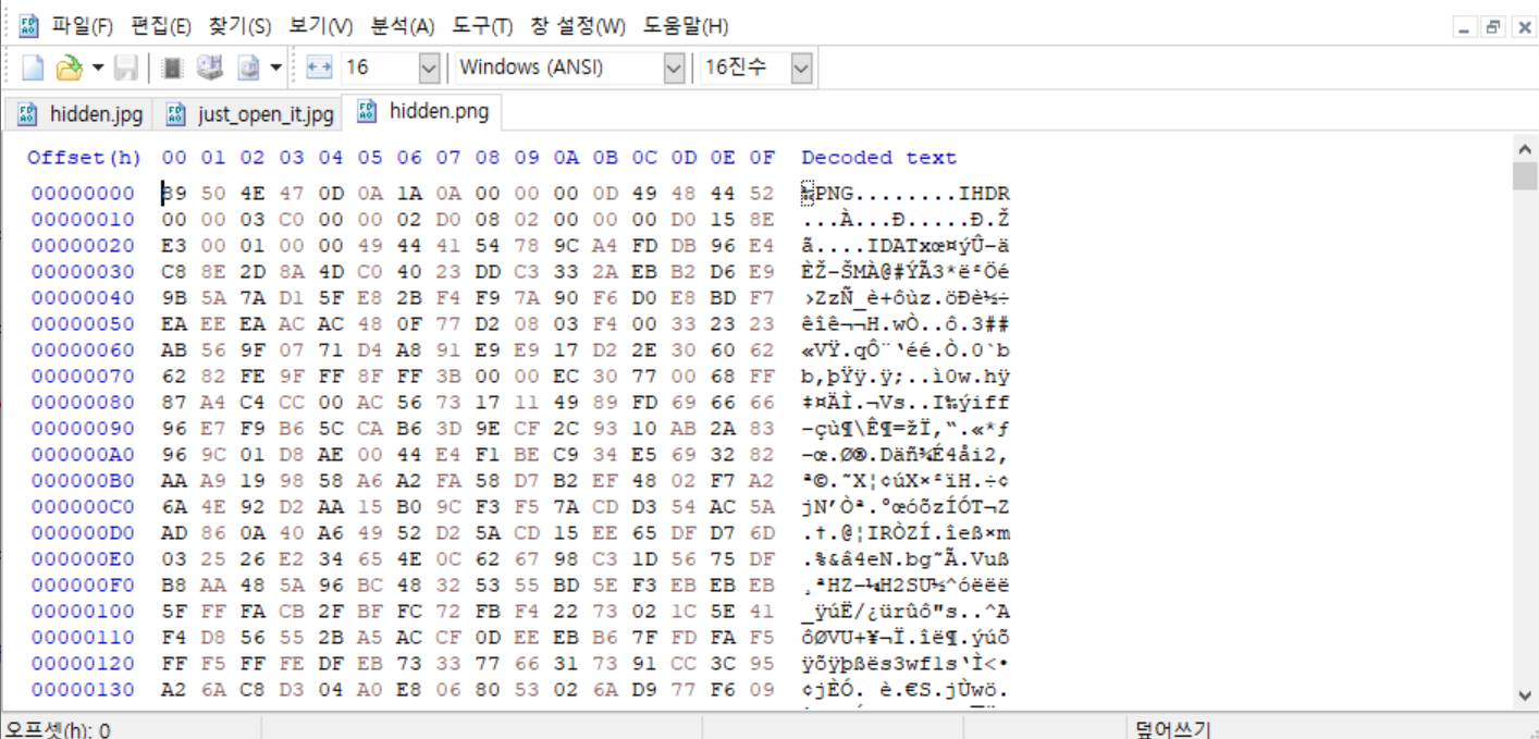 일단 HxD을 열어서 확인해봤는데 시그니처 헤더값이랑 트레일러 값이 정상적인 PNG 파일 형식이라는것을 알 수 있었다.