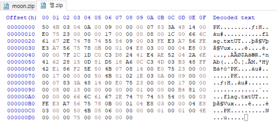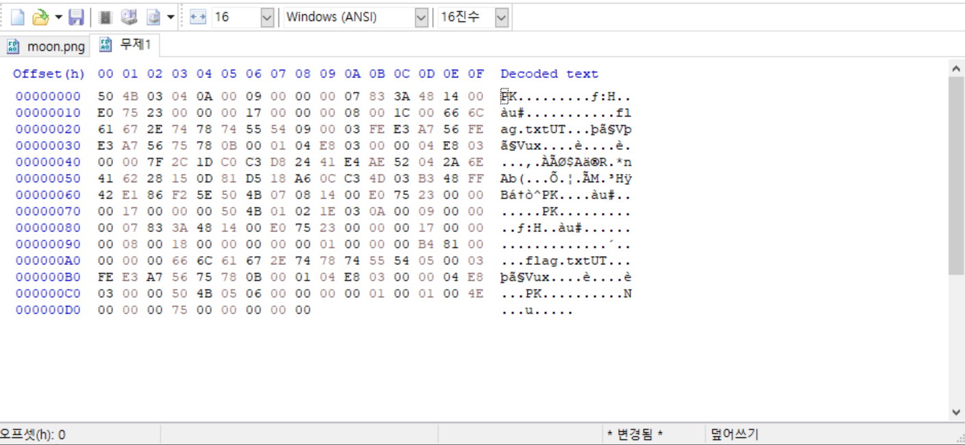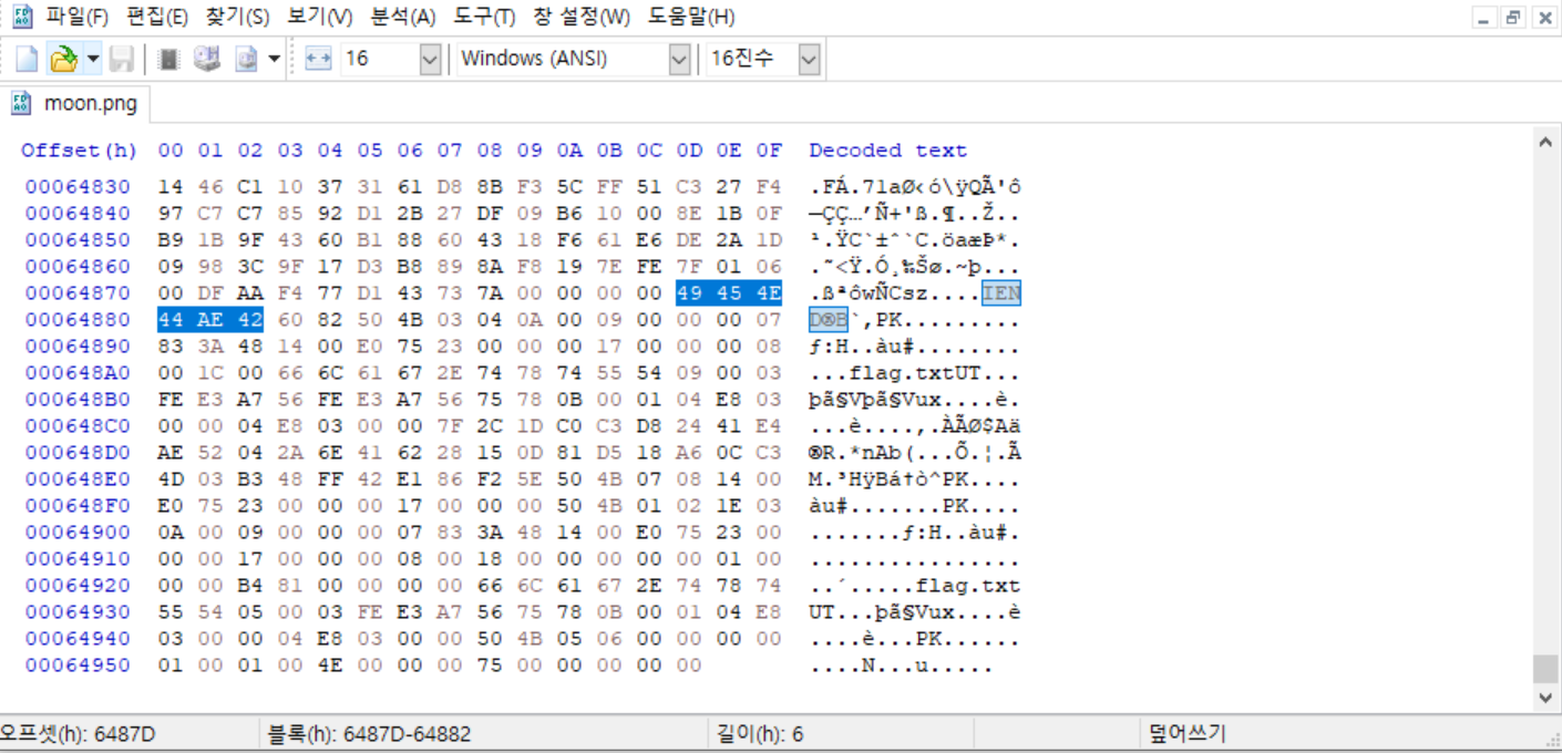 처음으로 HxD 안쓰고 그냥 분석한건데 역시나,, HxD를 보니 문제가 있다. PNG 파일 푸터는 49 45 4E 44 AE 42 60 82 인데 끝이 전혀 다름. 그리고 decoded text 부분에 flag.txt라는 문자열이 보이고 있다.