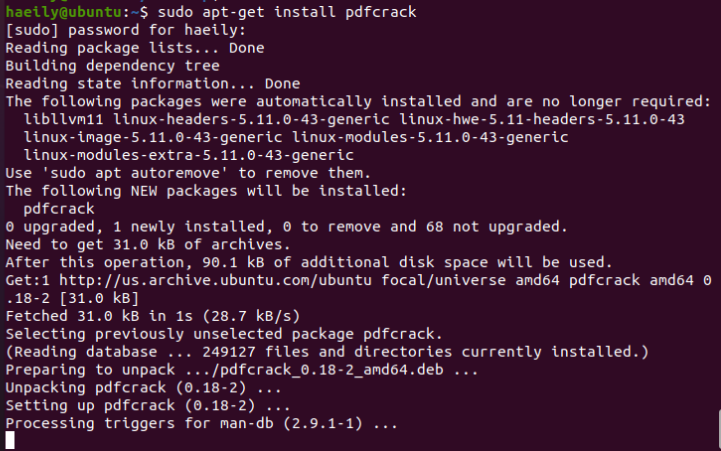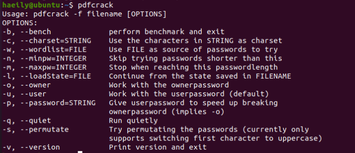 이렇게~~ sudo apt-get install pdfcrack 해서 깔면 된다.