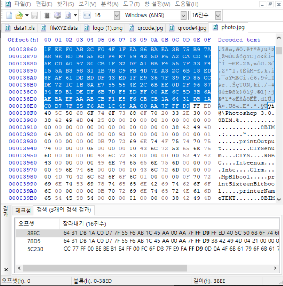 보니까 38ED에서 FF D9로 푸터가 나오길래 0부터 38ED까지 블록을 지정해서 JPG 파일을 저장해봤다.