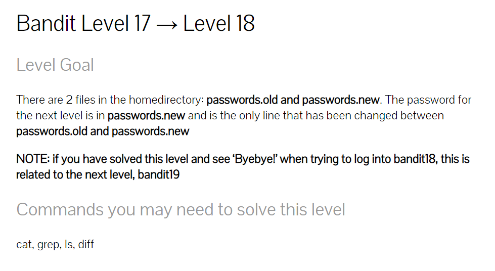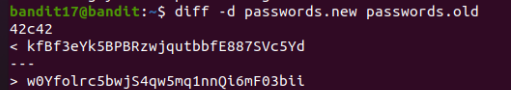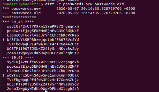 지금 bandit17 문제에서 해결해야 하는 건 passwords.new랑 passwords.old 파일을 비교해서 딱 다른 한 줄을 뽑아내는 거.