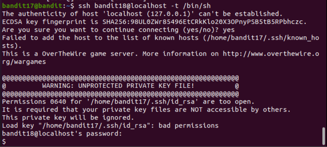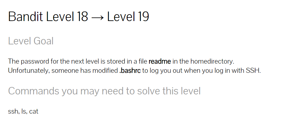 사실 전에 이 문제로 골머리를 앓았어서.. 이미 답을 알고 있는데, -t 옵션이 수도-tty 할당을 강제하는 기능을 가지고 있어서 ssh bandit18@localhost -t /bin/sh 이렇게 하면 쉘이 강제로 실행된다. 여기서 비밀번호를 확인할 수 있을 것이다.