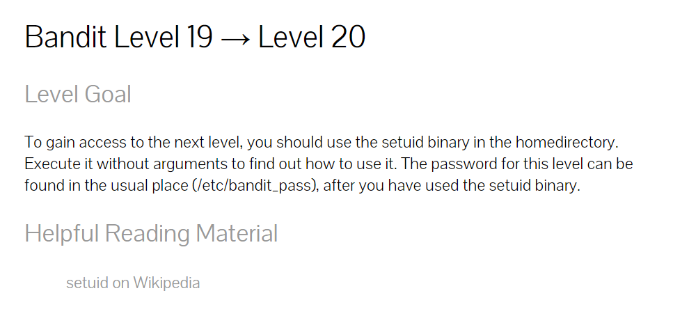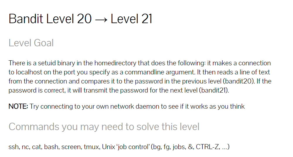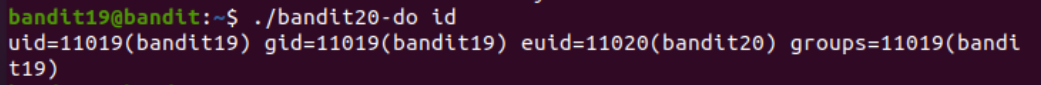 그냥 ./bandit20-do를 실행하면 Run a command as another user. 라는 명령어가 뜬다. 예시처럼 ./bandit20-do it라고 입력하면