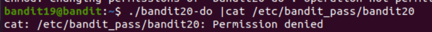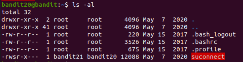 ls -al 명령어를 입력했을 때, 현재 bandit20-do 파일에 -rwsr-x--- 권한이 주어져 있다. 즉 sticky bit가 설정되어 있음.