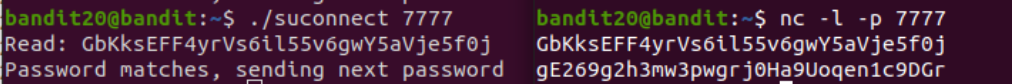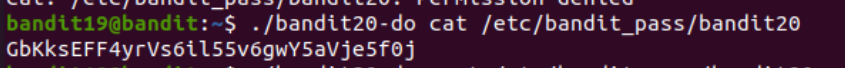 아까 ls -al bandit20-do을 했을때 볼 수 있듯이 이 파일에는 sticky bit가 설정되어 있으니까 이 파일을 실행할 때 만큼은 bandit20 사용자로 권한 상승이 가능하단 소리고, 이 파일이 실행되고 있을 동안 /etc/bandit_pass 폴더의 bandit20 파일을 읽으면 비밀번호를 읽을 수 있게 된다.