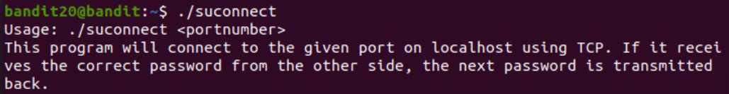 실행해봤더니 <portnumber>랑 같이 쓰라고 적혀있다. 그러니까 위에서 받은 bandit19->bandit20 비밀번호를 말하면 그 다음 비밀번호를 준다는 소린가보다..