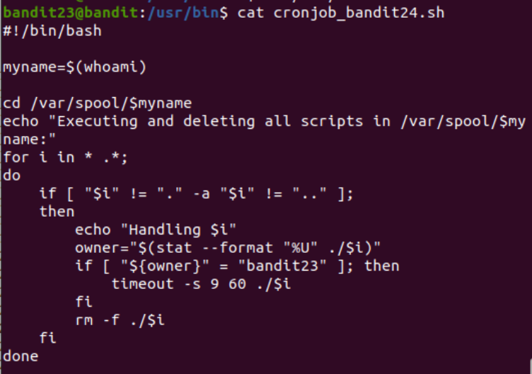 일단 /etc/cron.d의 cronjob_bandit24 파일을 읽어보았고, 그 전 문제들과 코드는 동일했다.