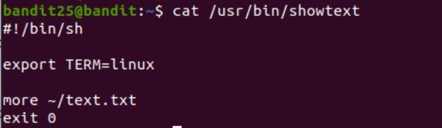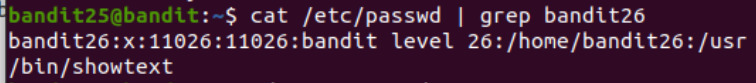 cat /etc/passwd는 passwd 파일에 로그인 정보를 지니고 있는데, bandit26을 보면 shell을 /usr/bin/showtext로 사용 중이다.