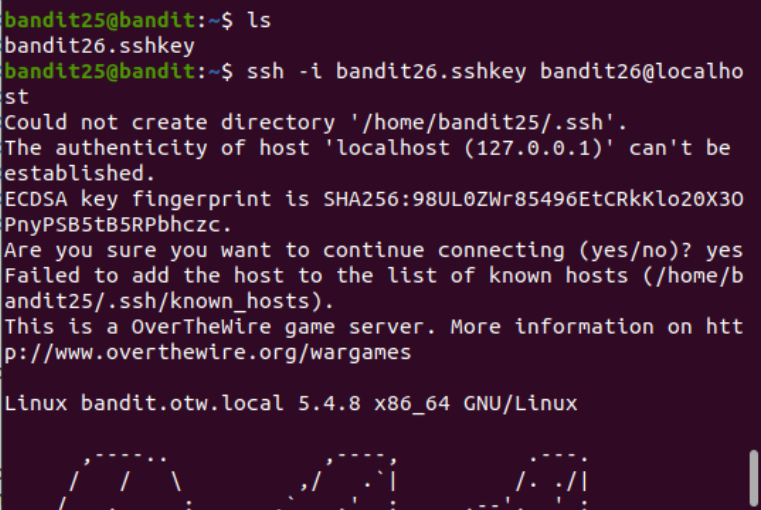 ssh -i bandit26.sshkey bandit26@localhost를 통해 rsa 파일로 ssh 접속을 시도했다.