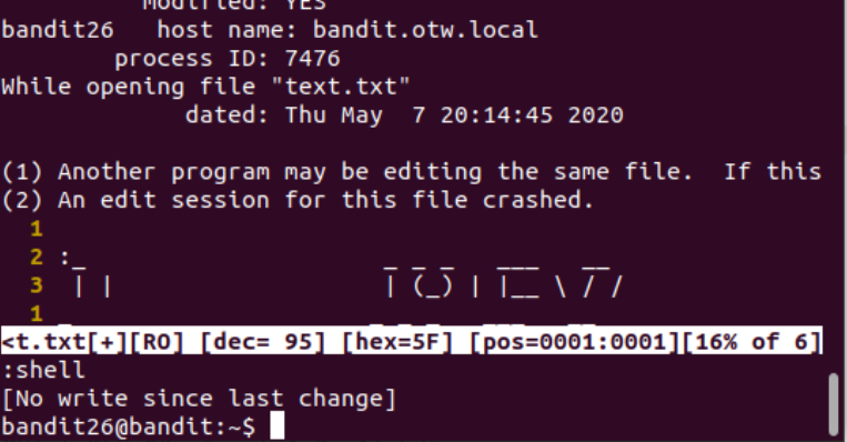 다음과 같이 bandit26에 접속한 것을 알 수 있다.