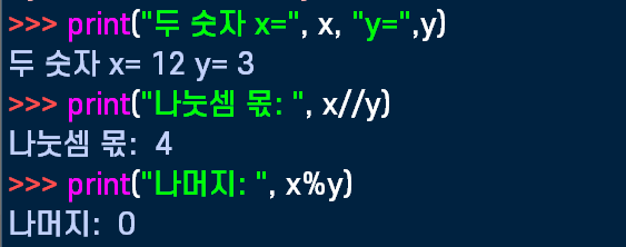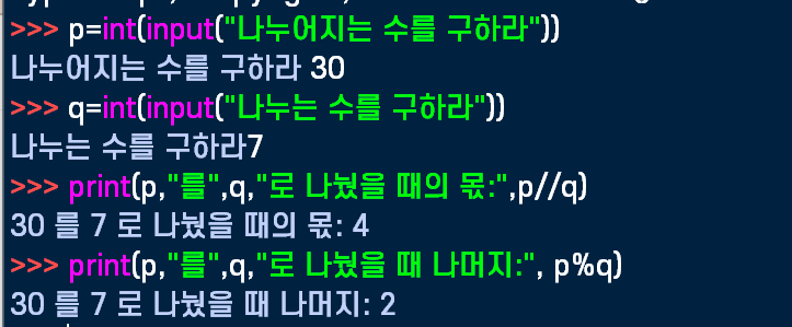 몫은 x//y로 나머지는 x%y로 구했다.