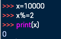 x%=2는 x=x%2니까 나머지 0이 출력된다.