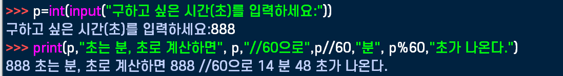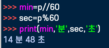 더 간편하게 계산하려면, p//60을 min이라는 변수에 넣어주면 되겠다. 그리고 sec이라는 변수엔 p%60이라는 연산을 넣어주면 됨.