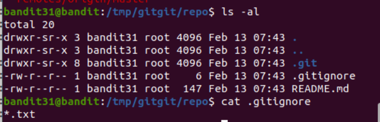 그리고 숨겨진 파일이 있나해서 repo 디렉터리에서 ls -al 명령어를 써줬는데, .gitignore이라는 파일이 보였다. 읽어봤더니 *.txt라는 문자열..만 들어있었음